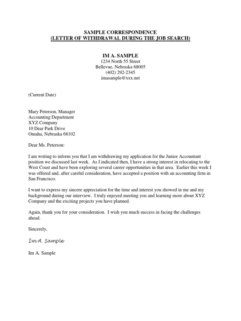 Required a format of letter which is written by a nominee of dead member of a epf trust for withdrawal of his pf amount. A letter of withdrawal is a formal letter written to end your relationship with an organization or individual, or in cases like a job offer, preventing a relationship from beginning in the first place. As i indicated then, i have a strong interest in relocating to the west coast and. I would like to thank you for all the time and consideration put into my application. Withdrawal from a job offer.